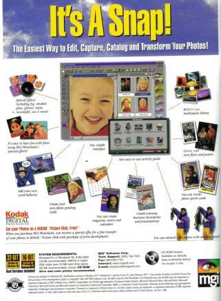 Designed for both home and business users. MGI PhotoSuite includes special effects and photo enhancing tools to transform photographs into exciting artistic expressions. Templates are included for creating greeting cards, sports cards, calendars and more. The powerful cataloging feature allows users to organize photos into albums and run slide shows. Experience the future of photography. Access your photo lab online to order reprints and photo gifts. Share your photos by email. Turn your photo albums into web pages and take snapshots of the web using the virtual camera.