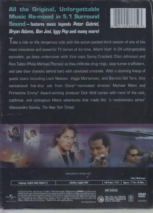 With a stunning lineup of guest stars including Liam Neeson, Viggo Mortensen, and Benicio Del Toro, this sensational five-disc set from Oscar®-nominated director Michael Mann and Primetime Emmy® Award-winning producer Dick Wolf delivers more of the cool, cutthroat, and contagious Miami adventures that made this "a revolutionary series" (Alessandra Stanley, The New York Times).