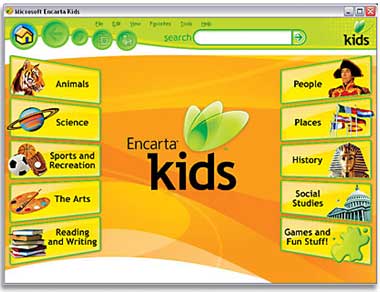 Encarta Kids: engage learners as young as 7 with pictures, games, large icons, and a simple, colorful interface that encourages exploration.