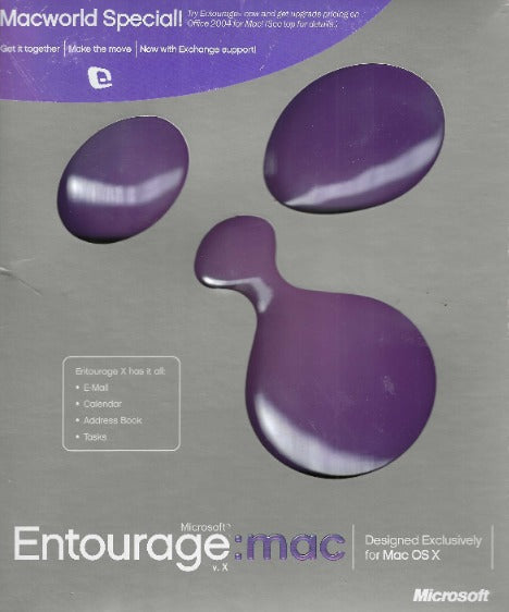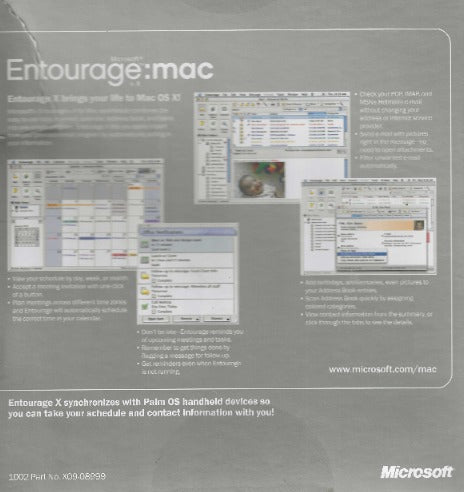 Microsoft Entourage X for Mac seamlessly combines the easy-to-use tools in e-mail, calendar, address book, and tasks into one simple program. Check e-mail from all of your various POP, IMAP, and even MSN Hotmail accounts, without changing your current e-mail address or Internet service provider. Entourage's junk mail filter will sort and file all your unwanted mail, so you can read only the e-mail that is important to you.