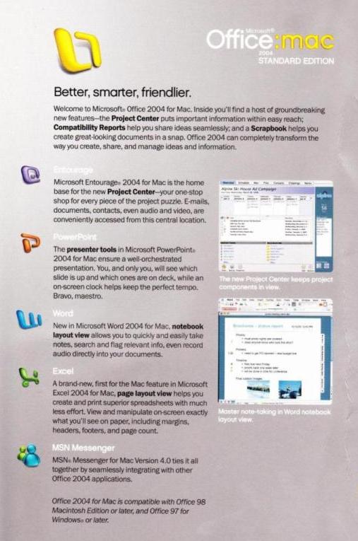 The new features in Microsoft Office 2004 for Mac aren't constrained by boundaries--in fact, many of them are designed to give you access to your ideas and information from every program in the suite. Thanks to input from thousands of Mac users, Office 2004 contains tools that are more integrated and intuitive than ever. The new Project Center allows you to consolidate all of your project-related details and easily access them from Word, Excel, Entourage, and PowerPoint 2004. Quickly view all of your project-related e-mail messages, files, notes, contacts and schedules in one convenient place. Plus, the new Project Gallery lets you quickly find the documents you've worked on recently while offering the new Learn tab to find instructive sample documents. Meanwhile, the new Compatibility Report tool helps you resolve platform- and version-related compatibility issues before they arise. The tool identifies potential compatibility issues and offers ways to avoid them. Lastly, the Office Toolbox lets you quickly access compatibility Reports, your Scrapbook and the Project Palette from Word, Excel or PowerPoint 2004.