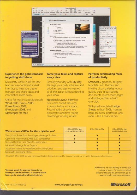 The latest version of the industry standard for productivity software on the Macintosh platform, Microsoft Office 2008 for Mac is more powerful and easier to use. Office 2008 combines Microsoft Word for Mac, Microsoft PowerPoint for Mac, Microsoft Excel for Mac, Microsoft Entourage for Mac, and Microsoft Messenger for Mac and lets you easily create high-impact documents and seamlessly share your ideas with others, whether they are on the Mac or Windows platform.