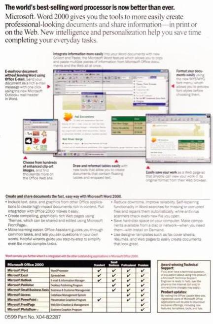 Microsoft Word 2000 was designed to be the easiest way to create common Web, e-mail, and print documents around the world. Microsoft Word is currently the application of choice for creating print documents. Word 2000 embraces HTML as a first-class file format, meaning users can save their documents to HTML with high fidelity allowing anyone with a Web browser to view the document while still being able to edit it and use all the functionality available in Word.
