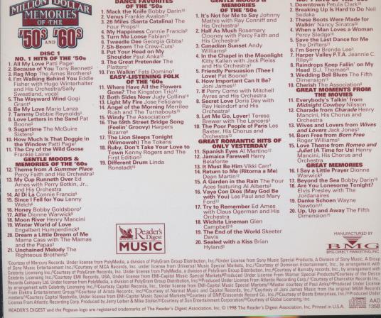 This four-disc compilation from Reader's Digest Music collects classic hits from the 1950s and 1960s. It features rock & roll, traditional pop, doo-wop and easy listening recordings from many well-known artists of the era. The set presents original hit recordings and provides a broad overview of popular American music across two influential decades. It's an ideal collection for listeners who enjoy nostalgic hits and vintage chart-toppers.