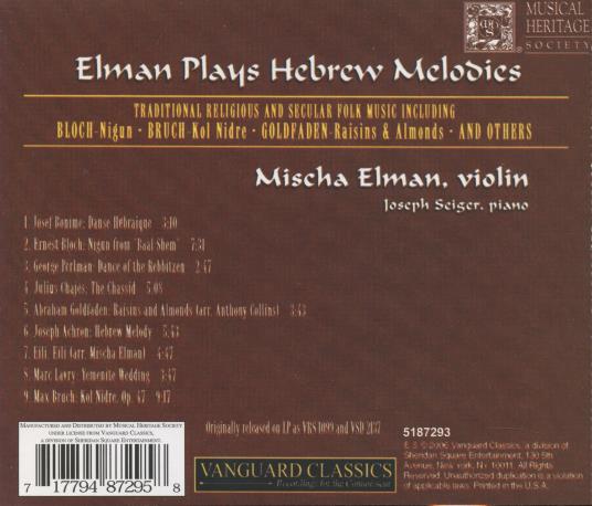 Mischa Elman: Elman Plays Hebrew Melodies MUSIC AUDIO CD classical jewish 2006