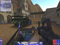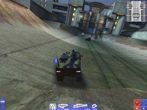 Players are allowed to switch between classes during play, instead of waiting to die and re-spawn, allowing strategies to be changed on the fly. The vehicle physics engine realistically models handling and accurately captures damage. When the tires are shot out, the vehicle handles sluggishly; if the gas tank is successfully targeted and hit, the vehicle explodes. Players can drive vehicles, or they can choose to ride "shotgun" while a teammate pilots. Online play is split between two teams, red and blue, with players allowed to choose and switch sides (though not in the middle of battles).