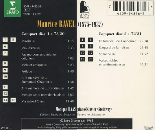 Monique HAAS, piano/Klavier (Steinway). Editions: Eschig, Enoch, Durand, Salabert. ADD. Total running time: 2:26. Made in Germany by Warner Music Manufacturing Europe. © Erato Disques s.a. 1968.