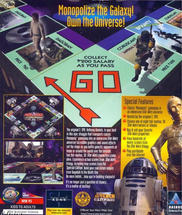 Two of the most dominant forces of 20th century American culture have combined in Monopoly Star Wars. As the name would imply, this CD-ROM combines the classic board game with the equally classic movie series. Gameplay is exactly the same as any other Monopoly game. The object of the game is to buy as much property as possible, eventually causing your opponents go bankrupt. Besides the same object and rules (all of which are by-the-book but adjustable -- no cheating, though!), Monopoly Star Wars has a different look to it than the board game. For example, instead of the car, the cowboy or the thimble, play as Luke Skywalker, Darth Vader or Boba Fett. Instead of houses and hotels, buy ships and starports.