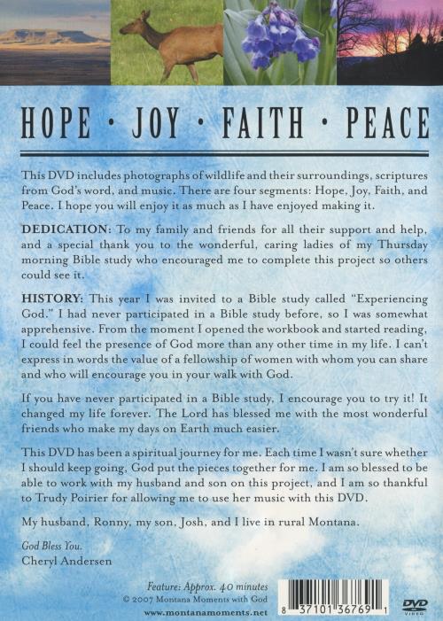 HOPE • JOY • FAITH • PEACE This DVD includes photographs of wildlife and their surroundings, scriptures from God's word, and music. There are four segments: Hope, Joy, Faith, and Peace. I hope you will enjoy it as much as I have enjoyed making it.