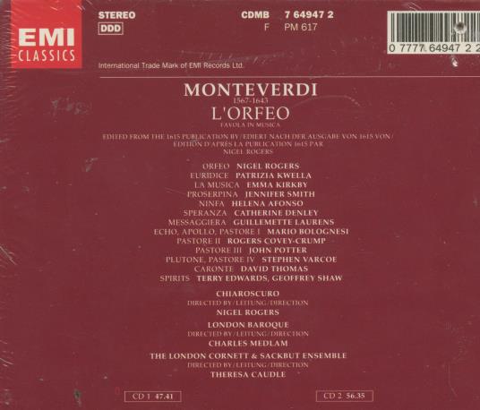 Monteverdi: L'Orfeo 1993 2-Disc MUSIC AUDIO CD classical renaissance EMI SEALED