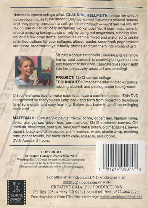 In her second DVD collage workshop, you meet Claudine Hellmuth and learn still more about her collage assemblage techniques. You'll learn how to alter books, image and transfer methods, mixed media techniques, acrylic painting, scrapbooking, rubber stamping, paper collage, making gifts for friends and family and more.