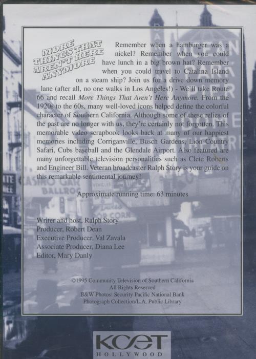 "Remember when a hamburger was a nickel? Remember when you could have lunch in a big brown hat? Remember when you could travel to Catalina Island on a steam ship? Join us for a drive down memory lane (after all, no one walks in Los Angeles!) - We'll take Route 66 and recall More Things That Aren't Here Anymore. From the 1920s to the 60s, many well-loved icons helped define the colorful character of Southern California. Although some of these relics of the past are no longer with us, they're certainly not forgotten. This memorable video scrapbook looks back at many of our happiest memories including Corriganville, Busch Gardens, Lion Country Safari, Cubs baseball and the Glendale Airport. Also featured are many unforgettable television personalities such as Clete Roberts and Engineer Bill. Veteran broadcaster Ralph Story is your guide on this remarkable sentimental joumey!".