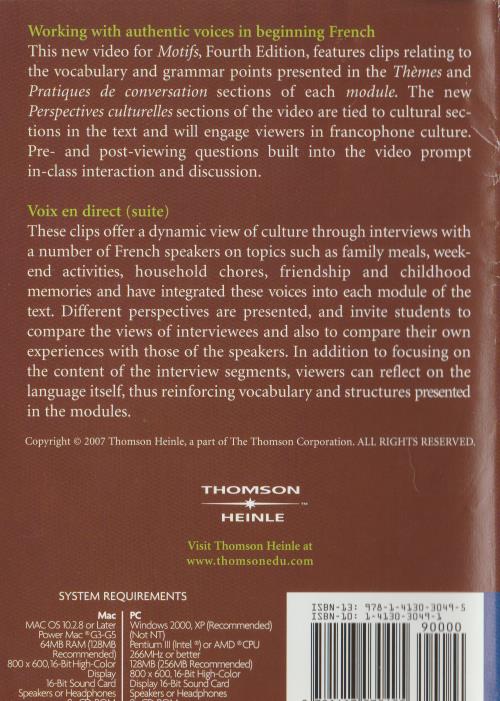 Working with authentic voices in beginning French This new video for Motifs, Fourth Edition, features clips relating to the vocabulary and grammar points presented in the Themes and Pratiques de conversation sections of each module. The new Perspectives culturelles sections of the video are tied to cultural sec-tions in the text and will engage viewers in francophone culture. Pre- and post-viewing questions built into the video prompt in-class interaction and discussion. Voix en direct (suite) These clips offer a dynamic view of culture through interviews with a number of French speakers on topics such as family meals, week-end activities, household chores, friendship and childhood memories and have integrated these voices into each module of the text. Different perspectives are presented, and invite students to compare the views of interviewees and also to compare their own experiences with those of the speakers. In addition to focusing on the content of the interview segments, viewers can reflect on the language itself, thus reinforcing vocabulary and structures presented in the modules.