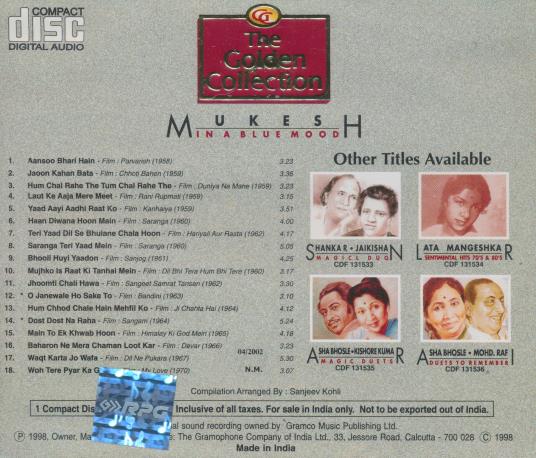 Mukesh: In A Blue Mood MUSIC AUDIO CD Bollywood classic Hindi film songs! 2002