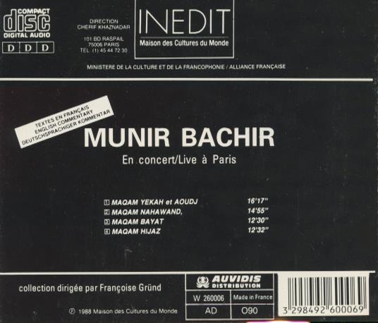 Munir Bachir is regarded as one of the great masters of the oud. This release captures his live performance in Paris, presenting extended instrumental explorations of classical Arabic maqam. The recording emphasizes lyrical improvisation, modal development and the traditional techniques of oud playing. It is a focused document for listeners interested in Arabic classical music and virtuosic string performance.