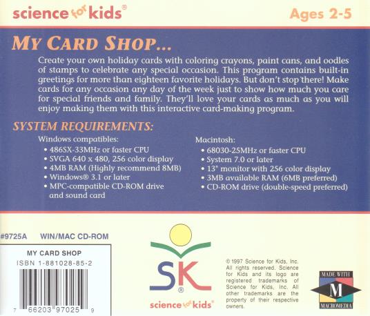 Create, design, paint, stamp and spray new cards for all your friends! science kids® MY CARD SHOP... Create your own holiday cards with coloring crayons, paint cans, and oodles of stamps to celebrate any special occasion. This program contains built-in greetings for more than eighteen favorite holidays. But don't stop there! Make cards for any occasion any day of the week just to show how much you care for special friends and family. They'll love your cards as much as you will enjoy making them with this interactive card-making program. ==
