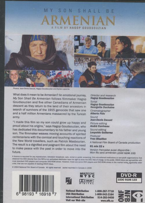 What does it mean to be Armenian? An emotional journey, *My Son Shall Be Armenian*, follows filmmaker Hagop Goudsouzian and five other Canadians of Armenian descent as they return to the land of their ancestors in search of survivors of the 1915 genocide that saw one and a half million Armenians massacred by the Turkish army. "I made this film so my son could grow up happy and proud about his origins," says Hagop Goudsouzian, who has dedicated this documentary to his father and young son. The filmmaker weaves moving accounts of spirited centenarians with the comical and touching reactions of the New World travellers, such as Patrick Masbourian. The result is a dignified and poignant film about the need to make peace with the past in order to move into the future.