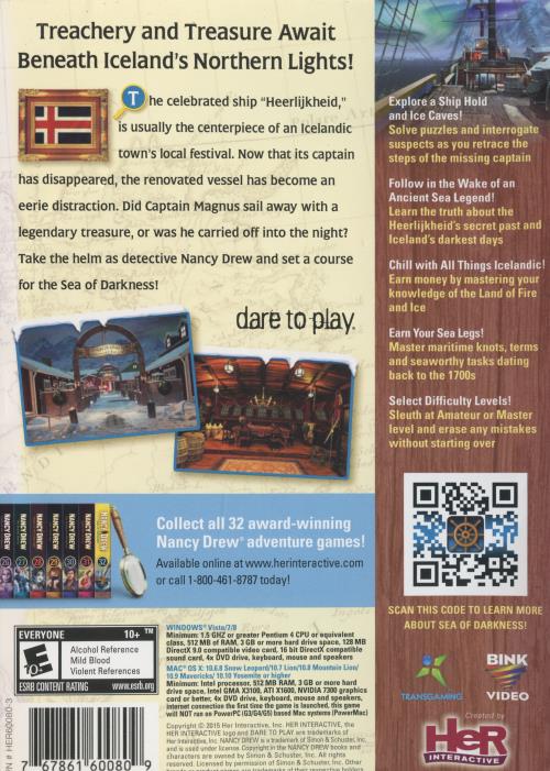 Set a Course for Danger and Discovery! The celebrated ship "Heerlijkheid," is usually the centerpiece of an Icelandic town's local festival. Now that its captain has disappeared, the renovated vessel has become an eerie distraction. Did Captain Magnus sail away with a legendary treasure, or was he carried off into the night? Take the helm as detective Nancy Drew and set a course for the Sea of Darkness!