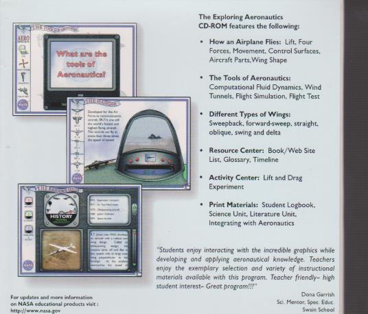 Exploring Aeronautics is designed for classroom use in grades S - 8. This exciting educational CD-ROM offers an introduction to aeronautics, covers the fundamentals of flight, contains an historical timeline, examines different types of aircraft and teaches students to use the tools of aeronautics used by researchers to test aircraft designs. This teacher-paced software includes lively animations, QuickTimerm movies and student activities promoting the use of the scientific method in the world of aeronautics.