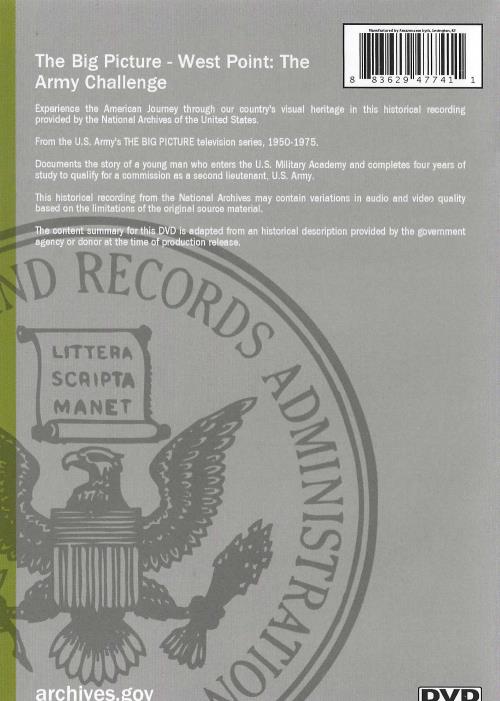Experience the American Journey through our country's visual heritage in this historical recording provided by the National Archives of the United States. From the U.S. Army's THE BIG PICTURE television series, 1950-1975. Documents the story of a young man who enters the U.S. Military Academy and completes four years of study to qualify for a commission as a second lieutenant, U.S. Army. This historical recording from the National Archives may contain variations in audio and video quality based on the limitations of the original source material. The content summary for this DVD is adapted from an historical description provided by the government agency or donor at the time of production release.