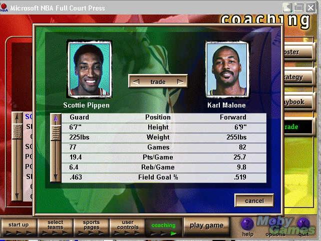 NBA Full Court Press features color commentary by Kevin Calabro and 250 player motions such as dunks, layups, and more. Individual player and team statistics are kept during the game as well as tracked throughout a season -- whether you play it by yourself, with friends, or have the computer simulate it for you. An in-game help menu even includes a glossary of basketball terms from "air ball" to "zone defense."
