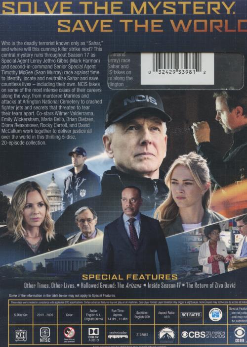 Who is the deadly terrorist known only as “Sahar,” and where will they strike next? This central mystery runs throughout Season 17 as Special Agent Leroy Jethro Gibbs (Mark Harmon) and second-in-command Senior Special Agent Timothy McGee (Sean Murray) race against time to identify, locate and neutralize Sahar and save countless lives – including their own. NCIS takes on some of the most intense cases of their careers along the way, from murdered Marines and attacks at Arlington National Cemetery to crashed fighter jets and secrets that threaten to tear their team apart. Co-stars Wilmer Valderrama, Emily Wickersham, Maria Bello, Brian Dietzen, Diona Reasonover, Rocky Carroll, and David McCallum work together to deliver justice all over the world in this thrilling 5-disc, 20-episode collection.