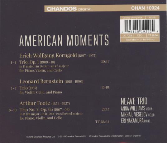 Neave Trio is a piano trio featuring violinist Anna Williams, cellist Mikhail Veselov and pianist Eri Nakamura. On American Moments they present a focused program of early 20th-century and American works by Erich Wolfgang Korngold, Leonard Bernstein and Arthur Foote. The ensemble is noted for clear ensemble playing, expressive phrasing and a warm, communicative sound. Their interpretations balance virtuosic flair with lyrical sensitivity across the program.