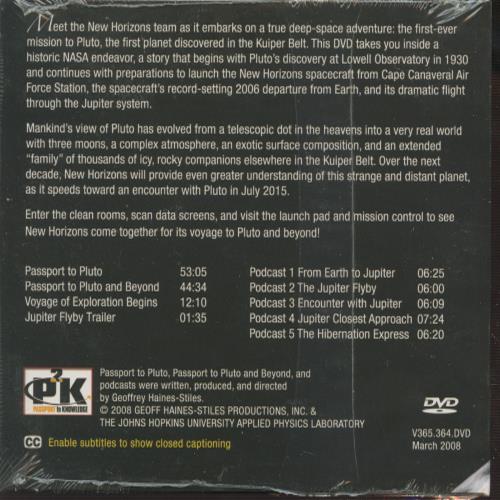 Meet the New Horizons team as it embarks on a true deep-space adventure: the first-ever mission to Pluto, the first planet discovered in the Kuiper Belt. This DVD takes you inside a historic NASA endeavor, a story that begins with Pluto's discovery at Lowell Observatory in 1930 and continues with preparations to launch the New Horizons spacecraft from Cape Canaveral Air Force Station, the spacecraft's record-setting 2006 departure from Earth, and its dramatic flight through the Jupiter system.