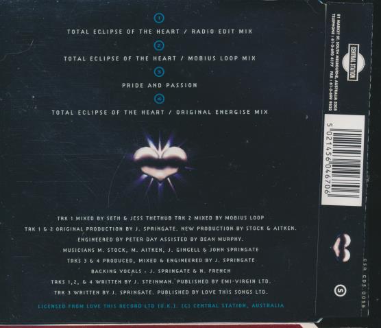 TRK 1 MIXED BY SETH & JESS THETHUB. TRK 2 MIXED BY MOBIUS LOOP. TRK 1 & 2 ORIGINAL PRODUCTION BY J. SPRINGATE. NEW PRODUCTION BY STOCK & AITKEN. ENGINEERED BY PETER DAY ASSISTED BY DEAN MURPHY. MUSICIANS M. STOCK, M. AITKEN, J. GINGELL & JOHN SPRINGATE. TRK'S 3 & 4 PRODUCED, MIXED & ENGINEERED BY J. SPRINGATE. BACKING VOCALS: J. SPRINGATE & N. FRENCH. TRK'S 1,2 & 4 WRITTEN BY J. STEINMAN. PUBLISHED BY EMI-VIRGIN LTD. TRK 3 WRITTEN BY J. SPRINGATE. PUBLISHED BY LOVE THIS SONGS LTD. LICENSED FROM LOVE THIS RECORD LTD (U.K.). (C) CENTRAL STATION, AUSTRALIA.
