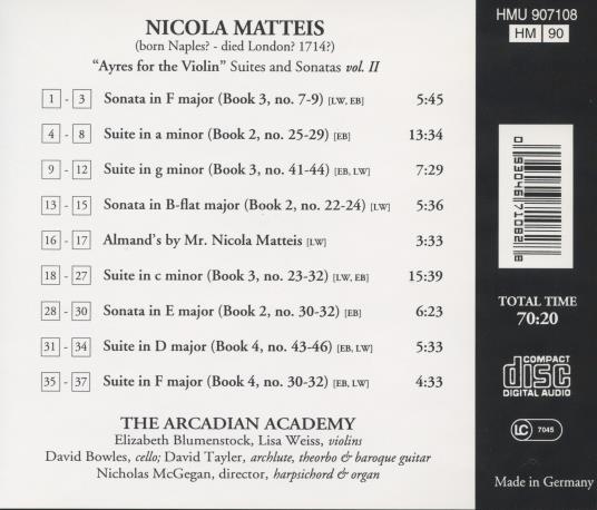Arcadian Academy, Nicholas McGegan, Nicola Matteis: Ayres for the Violin Suites And Sonatas Vol 2