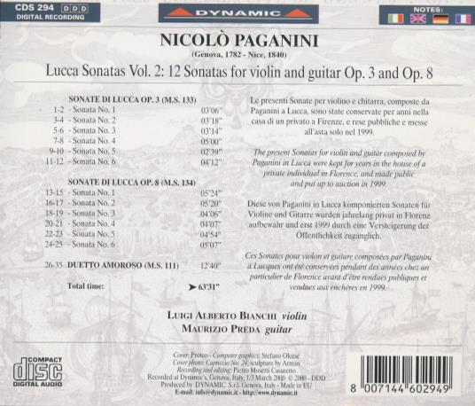 Performers: Luigi Alberto Bianchi (violin); Maurizio Preda (guitar). Banner on cover: Recently Rediscovered Manuscripts. Format: DDD Digital Recording. Total time: 63'31".