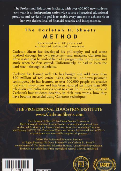 The Professional Education Institute, with over 400,000 new students each year, is an independent nationwide source of practical educational products and services. Its goal is to enable every student to achieve his or her own desired level of financial security and independence. The Carleton H. Sheets METHOD Developed over 30 years and millions of dollars of investment. Carleton Sheets has developed his philosophy and real estate method through his own successes—and mistakes. Carleton has often stated that he wished he had a program like this to read and study when he first started.