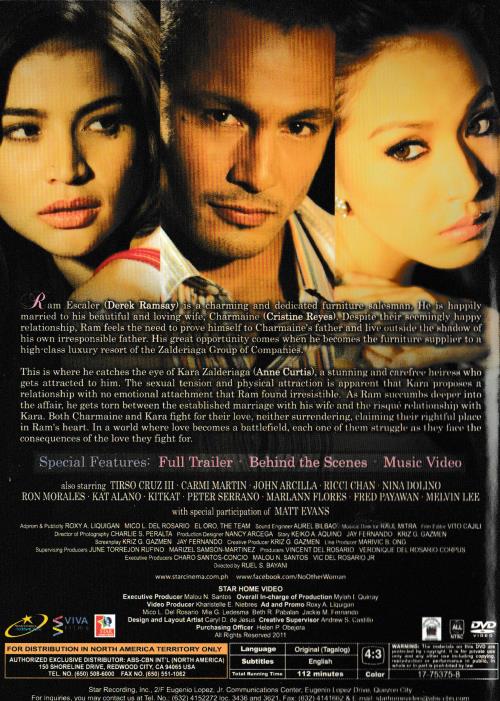 No Other Woman Uncut VersionFurniture supplier Ram (Derek Ramsay) is happily married to Charmaine (Cristine Reyes). Ram lands a big client, but he needs help from Kara (Anne Curtis), the daughter of the client, to finalize the deal. Kara fancies Ram to be her lover and seduces Ram, despite knowing about his marriage. Charmaine learns of the affair and fights for her husband. A Filipino drama film from Star Cinema.