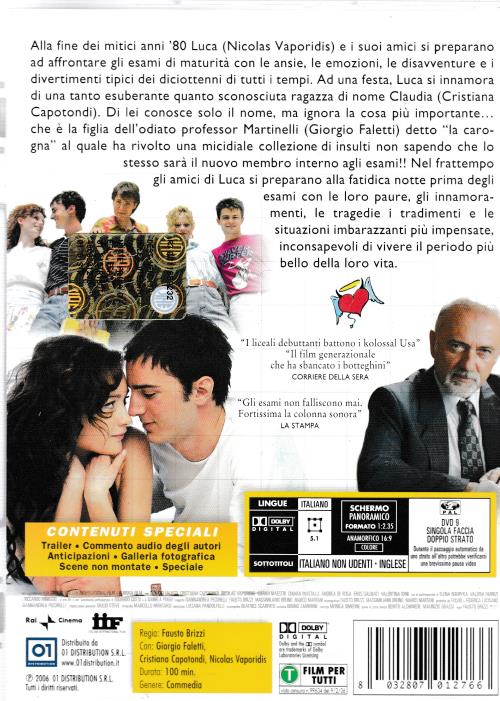 LINGUE ICI DIGITAL At the end of the legendary 1980s, Luca (Nicolas Vaporidis) and his friends prepare to face the final exams with the anxieties, emotions, misadventures, and typical fun of eighteen-year-olds of all time. At a party, Luca falls in love with a girl named Claudia (Cristiana Capotondi), as exuberant as she is unknown. He knows only her name, but ignores the most important thing... that she is the daughter of the hated Professor Martinelli (Giorgio Faletti), nicknamed "the dear-gnaw" to whom he has directed a deadly collection of insults without knowing that he will be the new member in charge of the exams!! In the meantime, Luca's friends prepare for the fateful night before the exams with their fears, romances, tragedies, betrayals, and embarrassing situations, unaware of living the most beautiful period of their lives.
