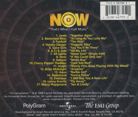 This compilation © & ℗ 1998 Capitol Records, Inc. and Virgin Records America, Inc./PolyGram Holding, Inc./Universal Music Group, Inc. All rights reserved. Manufactured by Virgin Records America, Inc., 338 N. Foothill Road, Beverly Hills, CA 90210. 'NOW' and 'NOW THAT'S WHAT I CALL MUSIC' Reg. U.S. Pat. & Tm Off. Printed in the USA.