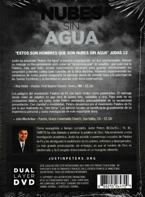 En Nubes sin Agua, Justin Peters presenta una crítica al movimiento Palabra de Fe que promueve una interpretación distorsionada del Evangelio. A través de su experiencia y vasta investigación, Peters desenmascara la farsa del evangelio de la prosperidad y la explotación de los vulnerables. Este DVD de doble capa es una herramienta educativa para uso privado.