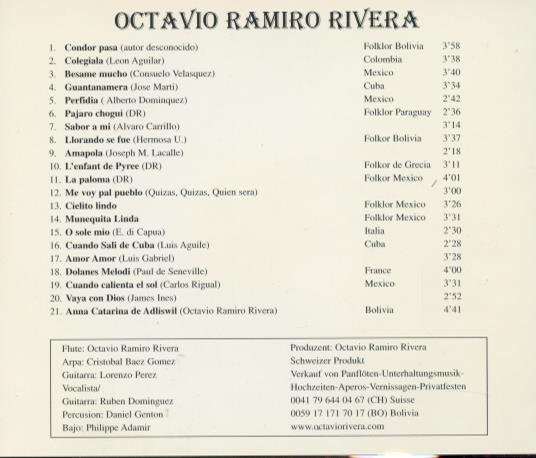 Credits: Flute: Octavio Ramiro Rivera; Arpa: Cristobal Baez Gomez; Guitarra: Lorenzo Perez; Guitarras: Ruben Dominguez; Percusion: Daniel Gertoni; Bajo: Philippe Adamir. Produzent: Octavio Ramiro Rivera. Schweizer Produkt.