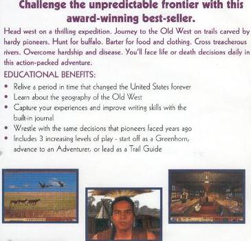 Challenge the unpredictable frontier with this award-winningbest-seller. Head west on a thrilling expedition. Journey to the OldWest on trails carved by hardy pioneers. Hunt for buffalo. Barter for foodand clothing. Cross treacherous rivers. Overcome hardship anddisease. You'll face life or death decisions daily in this action-packedadventure. Journey with the pioneers on the adventure of a lifetime! Hang on to your hats! State-of-the-art CD-ROM technology puts you at the reins of a covered wagon as you cross treacherous mountains, barter for clothing, and hunt buffalo to survive. Relive an exciting period of history in this action-packed adventure, a challenging historical simulation that teaches you about the life of the Western emigrants by putting you in the midst of the action.