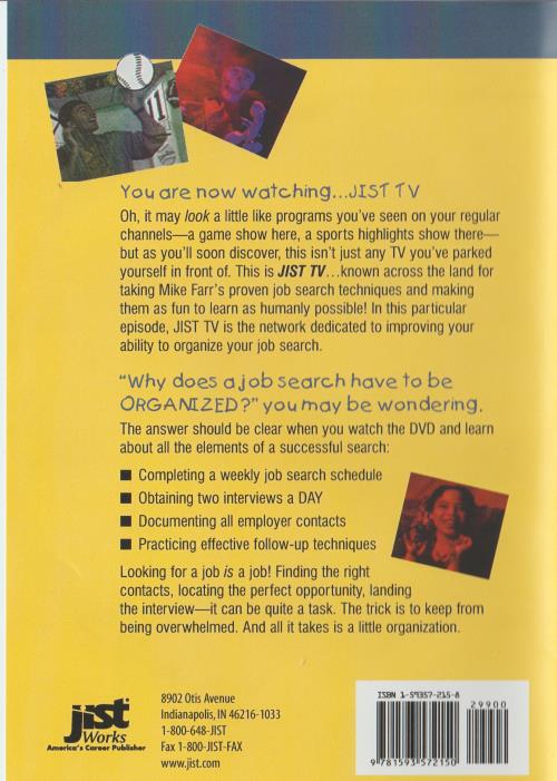 Oh, it may look a little like programs you've seen on your regular channels—a game show here, a sports highlights show there but as you'll soon discover, this isn't just any TV you've parked yourself in front of. This is JIST TV...known across the land for taking Mike Farr's proven job search techniques and making them as fun to learn as humanly possible! In this particular episode, JIST TV is the network dedicated to improving your ability to organize your job search. "Why does ajob search have to be ORGANIZED?" you may be wondering. The answer should be clear when you watch the DVD and learn about all the elements of a successful search: ■ Completing a weekly job search schedule ■ Obtaining two interviews a DAY ■ Documenting all employer contacts ■ Practicing effective follow-up techniques Looking for a job is a job! Finding the right contacts, locating the perfect opportunity, landing the interview—it can be quite a task. The trick is to keep from being overwhelmed. And all it takes is a little organization