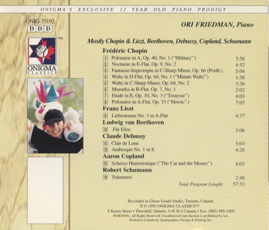 Ori Friedman: Mostly Chopin MUSIC AUDIO CD classical piano prodigy! Onigma 1995