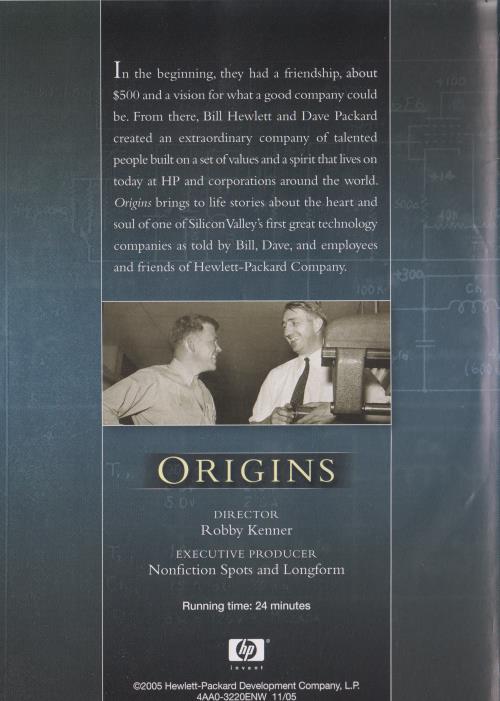 In the beginning, they had a friendship, about $500 and a vision for what a good company could be. From there, Bill Hewlett and Dave Packard created an extraordinary company of talented people built on a set of values and a spirit that lives on today at HP and corporations around the world. Origins brings to life stories about the heart and soul of one of Silicon Valley's first great technology companies as told by Bill, Dave, and employees and friends of Hewlett-Packard Company.