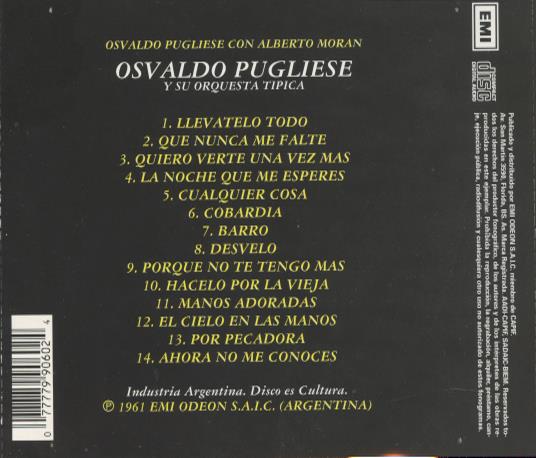 Osvaldo Pugliese is an iconic Argentine tango pianist and bandleader known for powerful and rhythmic arrangements. This release features vocalist Alberto Morán together with Osvaldo Pugliese y su Orquesta Típica. The recordings exemplify classic mid century Argentine tango with dramatic phrasing and rich orchestration. The album was issued in Argentina by EMI Odeon.