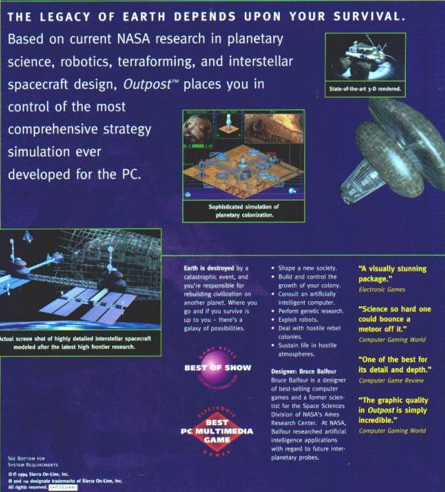 Outpost is a strategy intensive, world-building game designed by a former scientist Bruce Balfour of the Space Sciences Division of NASA's Ames Research Center. As a researcher of computer artificial intelligence routines applied to galactic probes, Balfour brings realism and tons of hard science to the computer game screen in Outpost. The game features brilliant SVGA graphics and an intuitive point-and-click interface with menu based commands. On-line help is available with a simple right click of the mouse on most on-screen items.