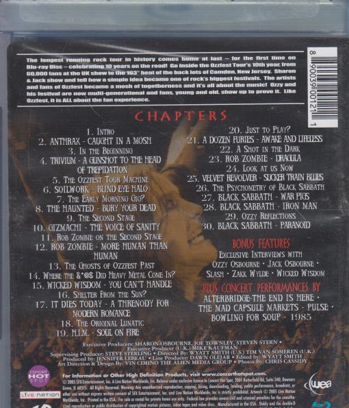 The longest running rock tour in history comes home at last for the first time on Blu-ray Disc, celebrating 10 years on the road. Go inside the Ozzfest Tour's 10th year, from 60,000 fans at the U.K. show to the 103° heat of the back lots of Camden, New Jersey. Sharon and Jack Osbourne explain how a simple idea became one of rock's biggest festivals. The artists and fans of Ozzfest became a mosh of togetherness and it's all about the music. Ozzy and his festival are now multi-generational, and fans young and old show up to prove it. Like Ozzfest, it is all about the fan experience.