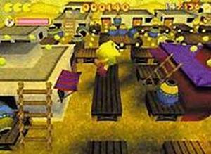 Pac-Man: Adventures in Time gives the famous round yellow fellow a fresh new 3D look and sends him off through mazes and challenging environments set throughout history. Pac-Man's temporal travels take him from a prehistoric land of dinosaurs, into an Egyptian pyramid, through a town in the old west, and even into a science-fiction future. Ghosts and other characters are often "dressed" to match the current time period. Most of the levels view the pellet-gobbling action from a slight angle looking down on the scene, which provides a greater sense of depth. Other levels make full use of all three dimensions, sending Pac-Man to munch his way across a revolving globe or navigate his way up and down a maze carved around a giant tree trunk.