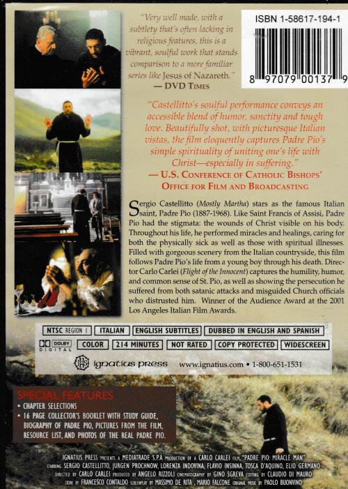 Sergio Castellitto (Mostly Martha) stars as the famous Italian saint, Padre Pio (1887-1968). Like Saint Francis of Assisi, Padre Pio had the stigmata: the wounds of Christ visible on his body. Throughout his life, he performed miracles and healings, caring for both the physically sick as well as those with spiritual illnesses. Filled with gorgeous scenery from the Italian countryside, this film follows Padre Pio's life from a young boy through his death. Direc-tor Carlo Carlei (Flight of the Innocent) captures the humility, humor, and common sense of St. Pio, as well as showing the persecution he suffered from both satanic attacks and misguided Church officials who distrusted him. Winner of the Audience Award at the 2001 Los Angeles Italian Film Awards.
