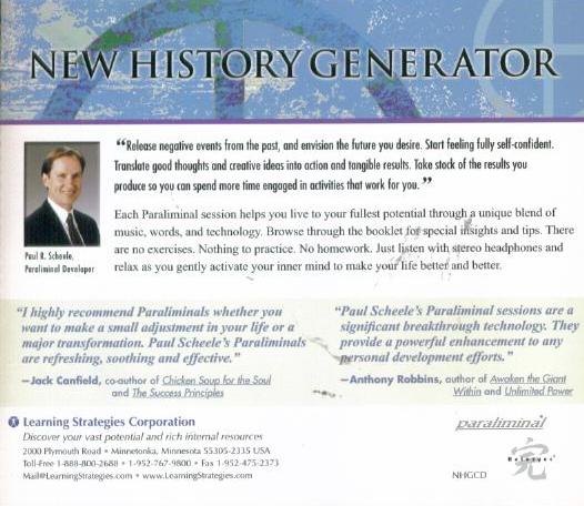 New History Generator can also help when anxieties about the future keep you from taking action and achieving what you want. Anxiety cannot be felt unless you are imagining a negative future that you fear. Since you are in charge of what you imagine, you can use this CD to tap into the tremendous personal power within so that you achieve the success you desire.