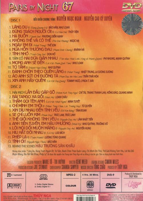 Paris By Night In San Jose 67 is a captivating live performance event produced by Thuy NGA, an organization known for its vibrant and colorful showcases of Vietnamese culture and entertainment. This particular 2-disc set captures the essence of the musical and artistic experience that the Paris By Night series is celebrated for.