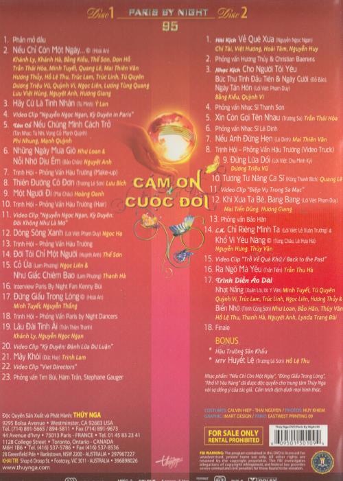 Paris By Night 95, titled Cảm Ơn Cuộc Đời, is a special anniversary music and variety production from Thúy Nga. This two-disc program features a wide array of performances, musical numbers, and special segments from many of the program series most beloved artists. The show celebrates life with vibrant staging, choreography, and a collection of classic and contemporary Vietnamese songs.