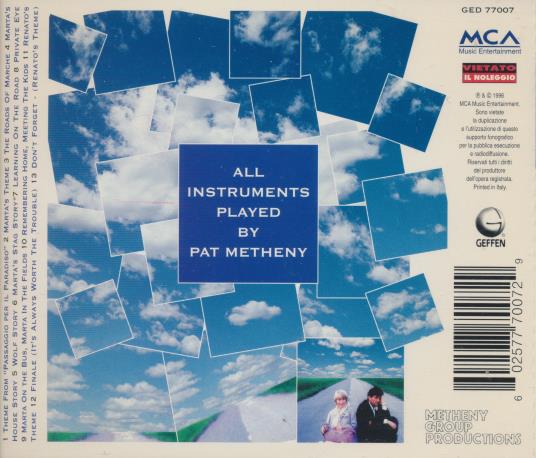 All instruments played by Pat Metheny. Original soundtrack to the motion picture Passaggio per il Paradiso. Produced by Metheny Group Productions. (P) & (C) 1996 MCA Music Entertainment. Printed in Italy.